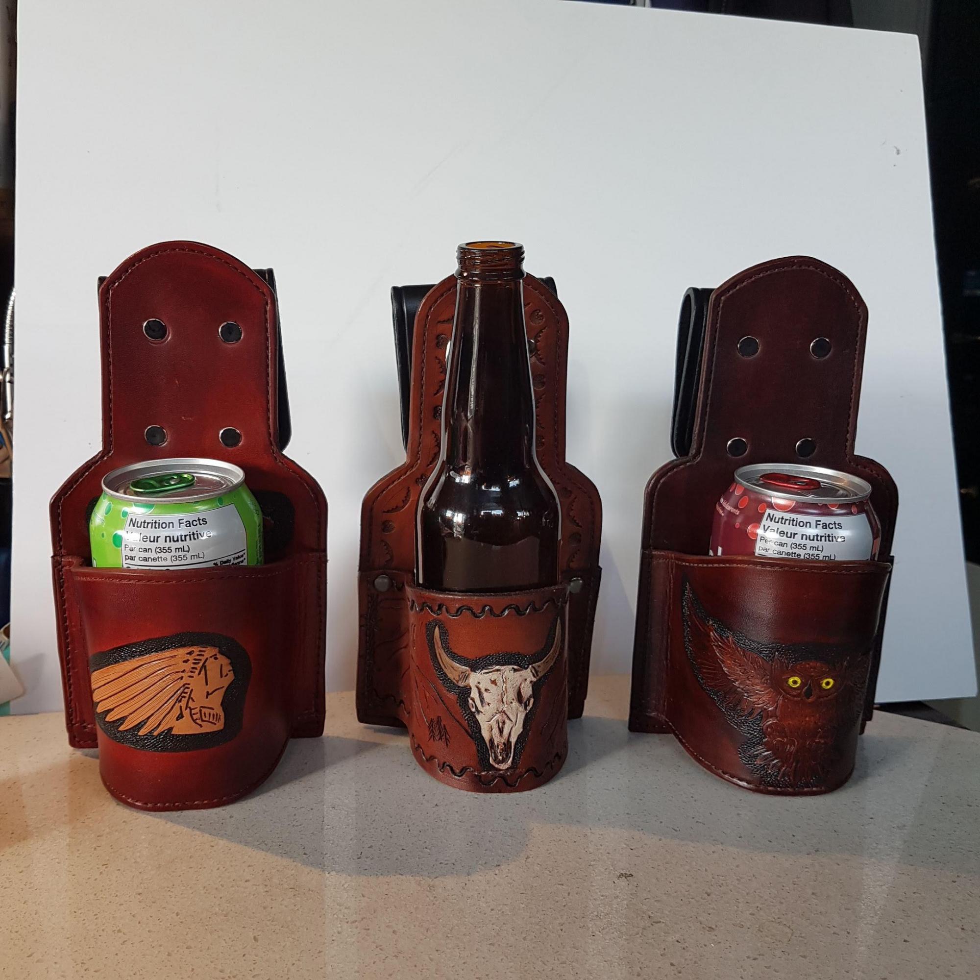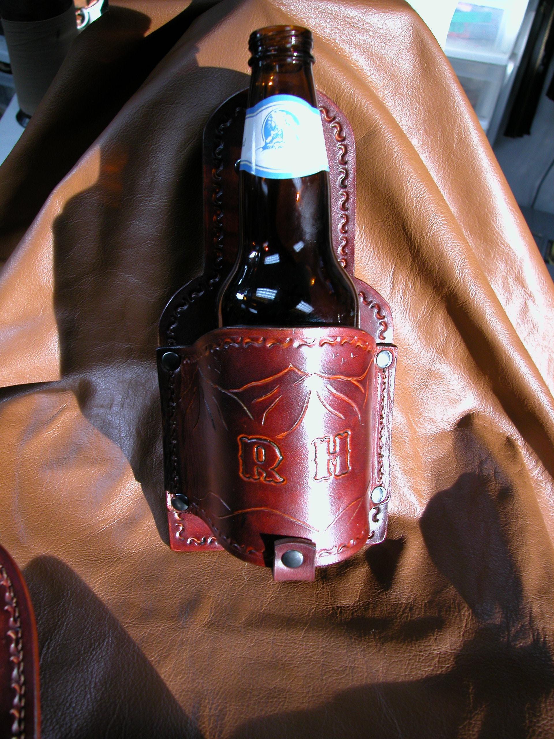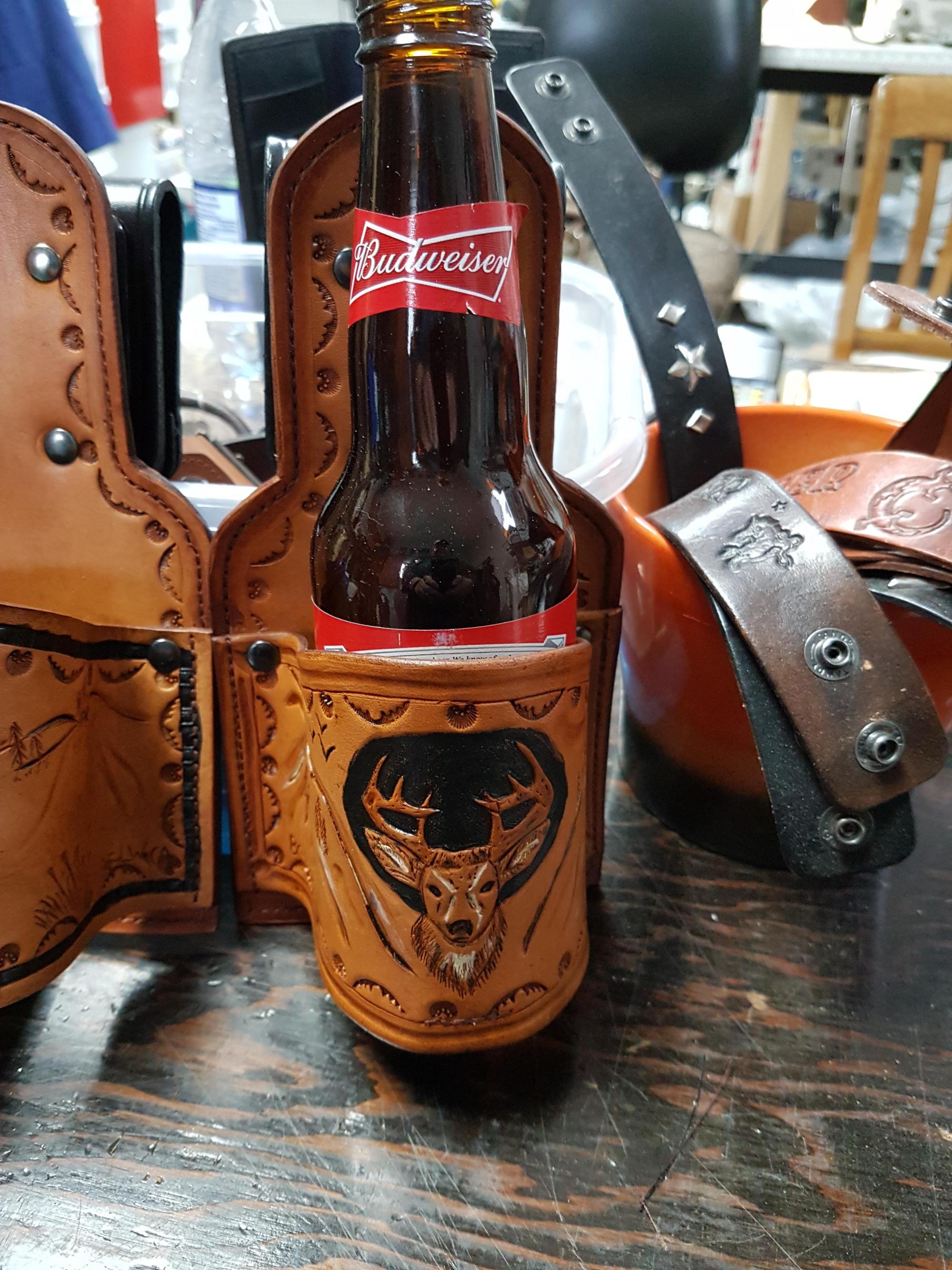Beer Holster With a Swivel Clip, Tired of your Beer getting warm in your Hand. The Swivel Clip and the Beer Holster Separate for Quick Draw Drinking. Custom Made With A Full Grain Leather With Hand tooled Design.