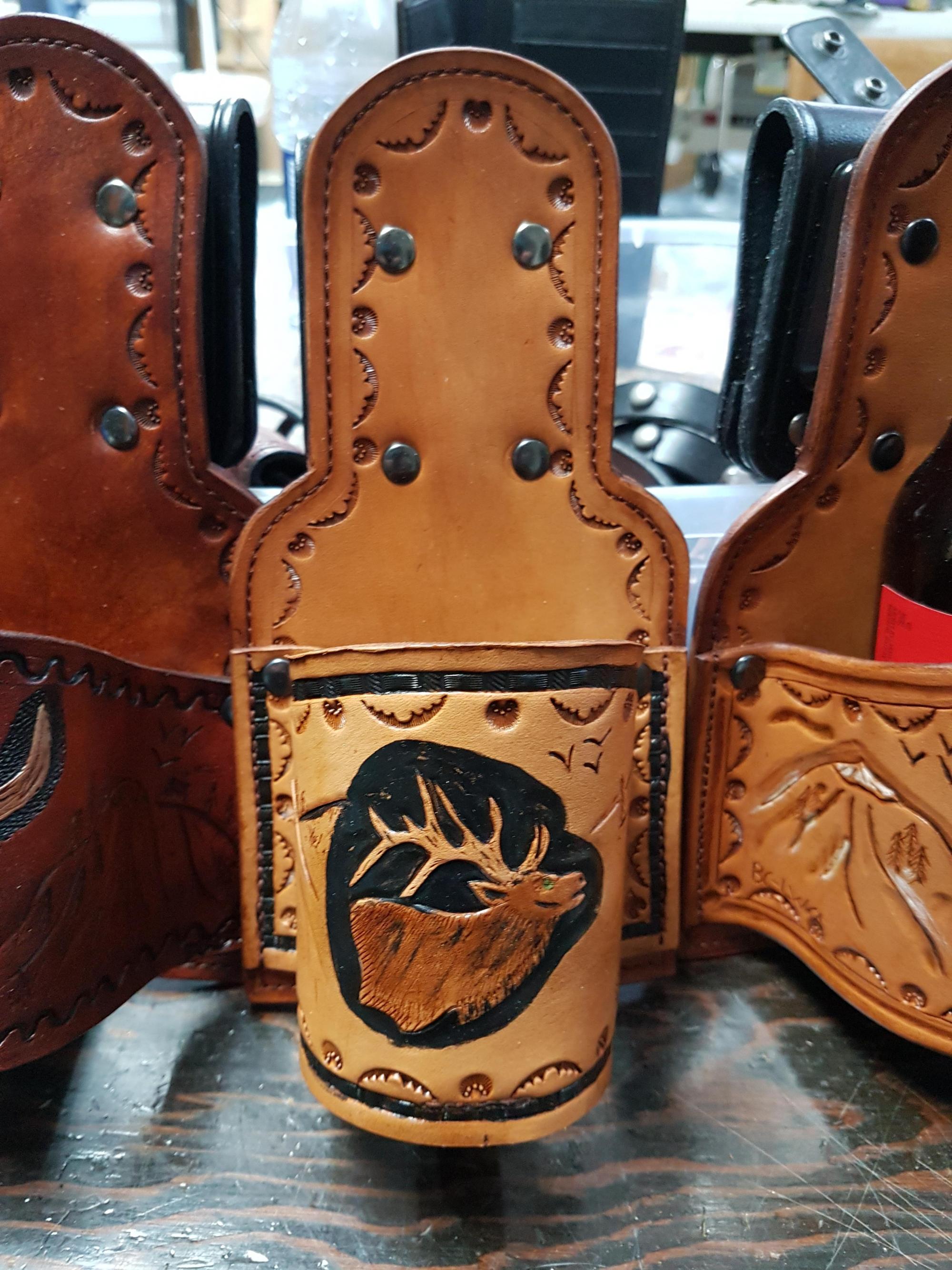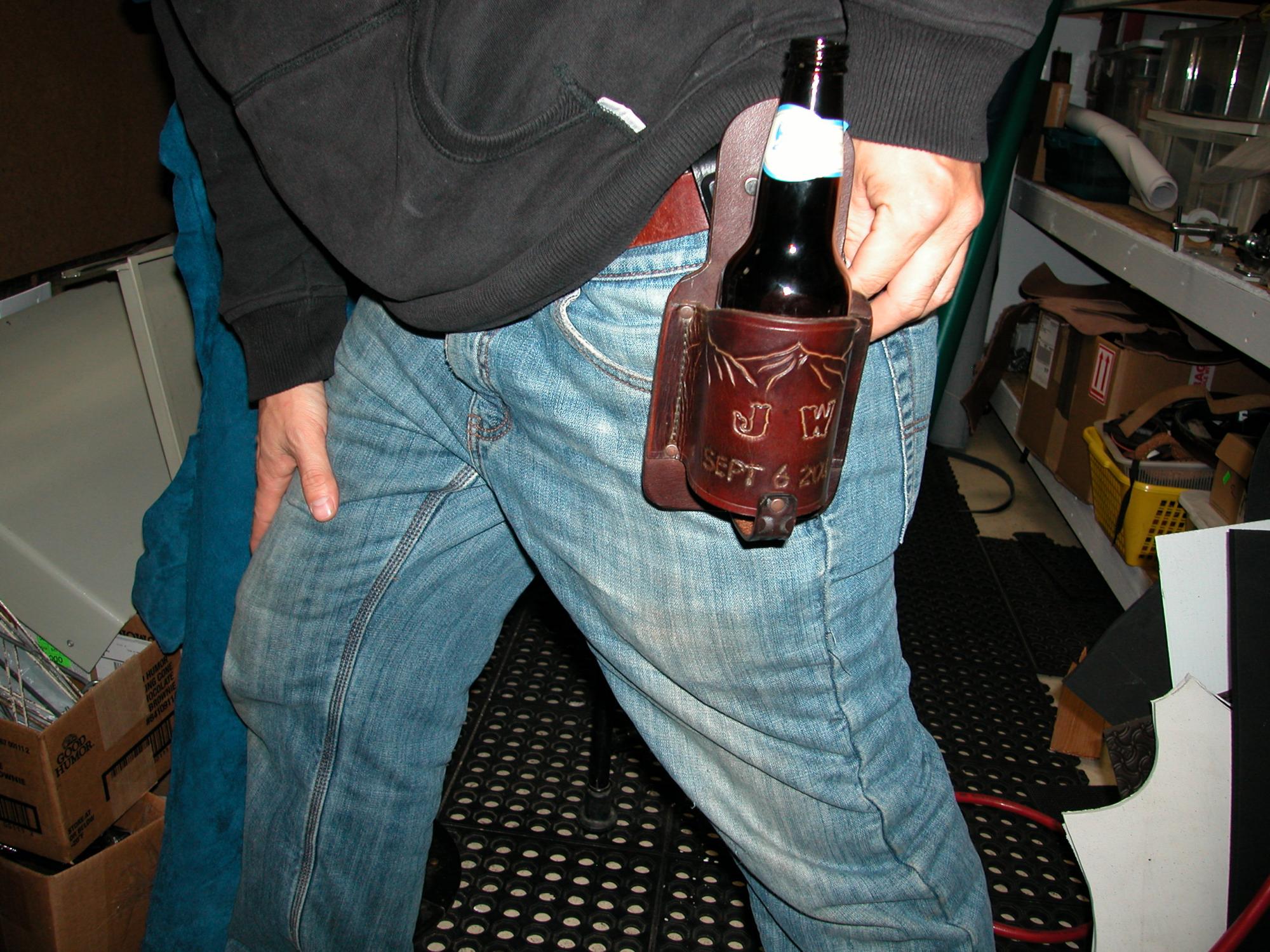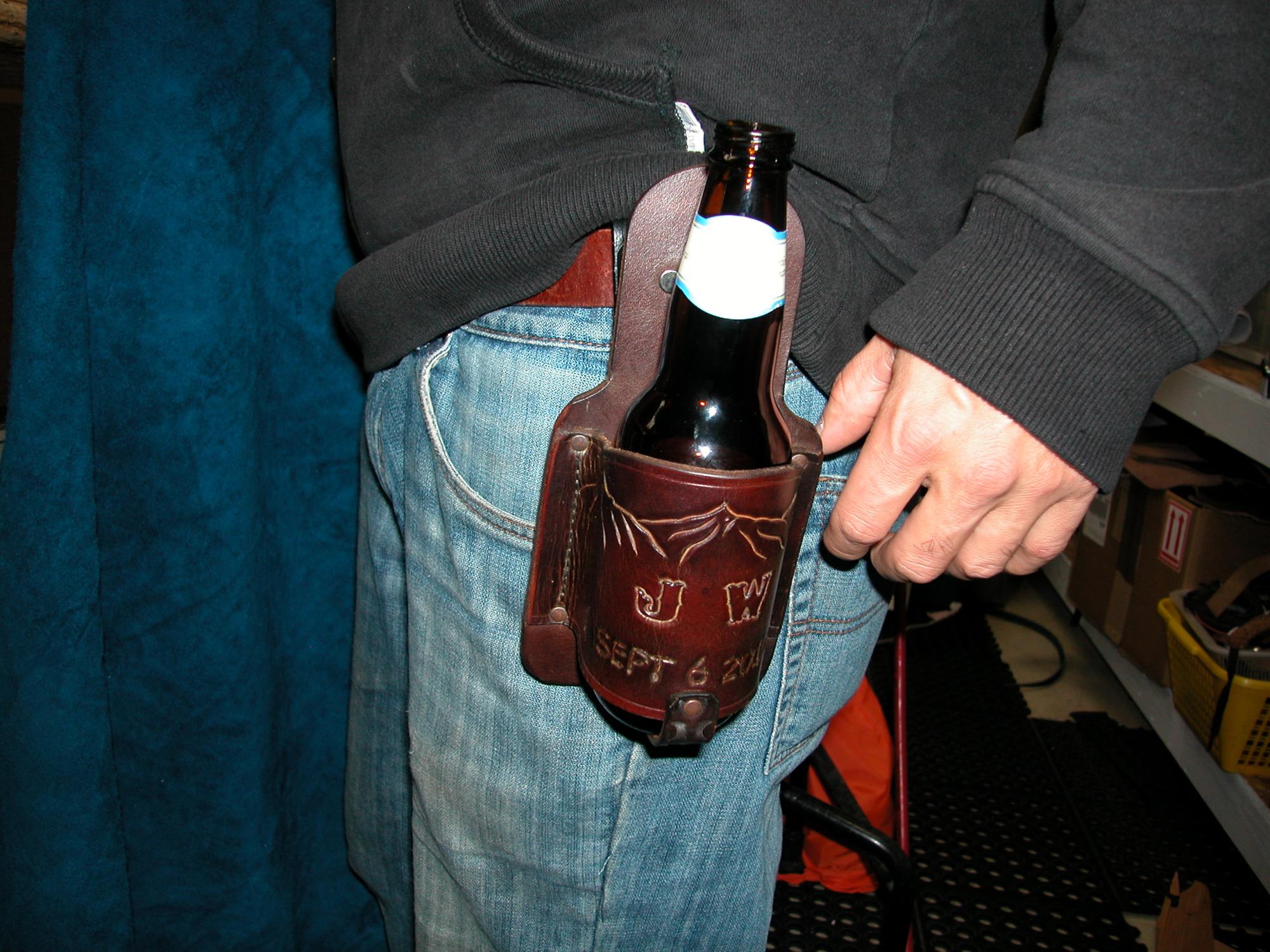 Beer Holster With a Swivel Clip, Tired of your Beer getting warm in your Hand. The Swivel Clip and the Beer Holster Separate for Quick Draw Drinking. Custom Made With A Full Grain Leather With Hand tooled Design.