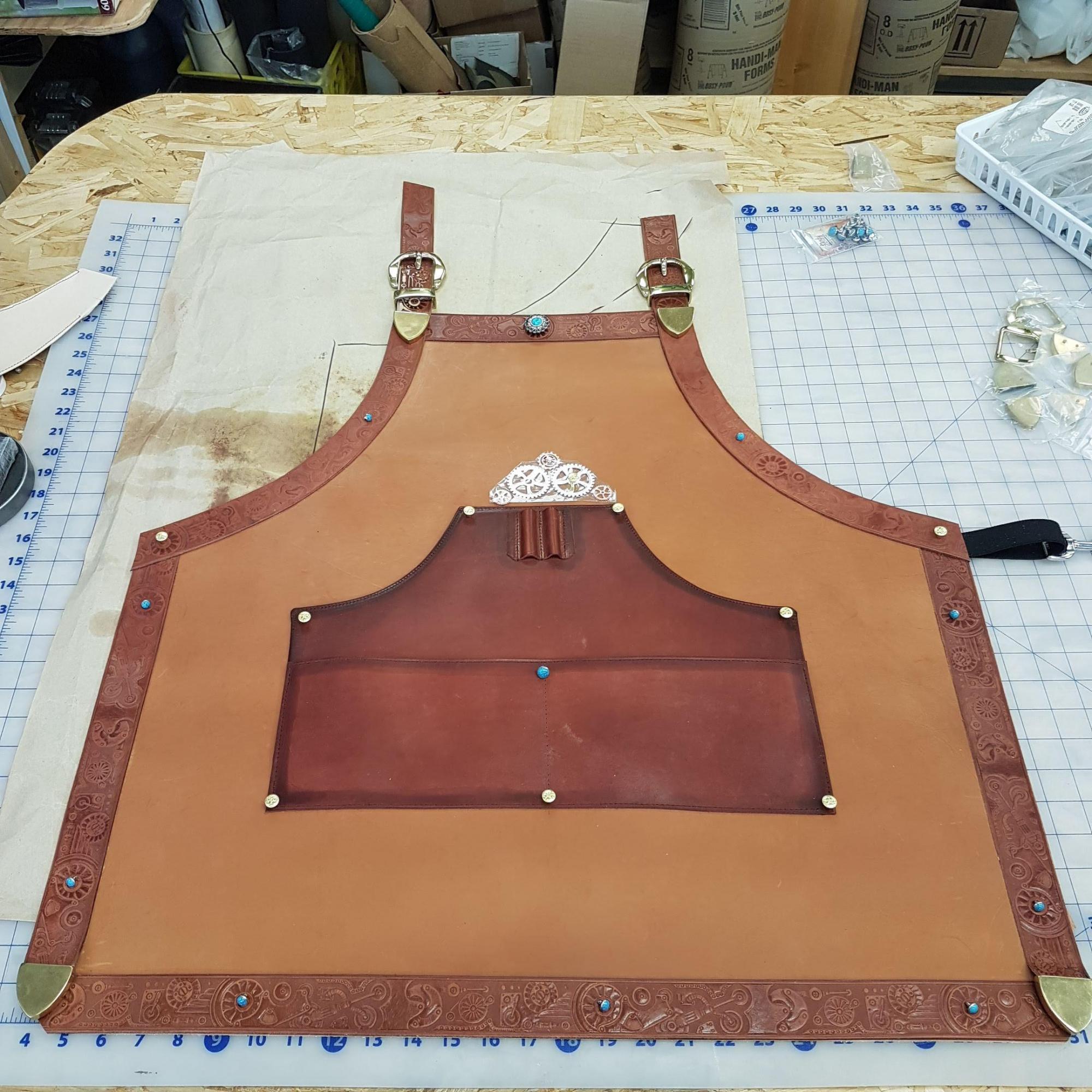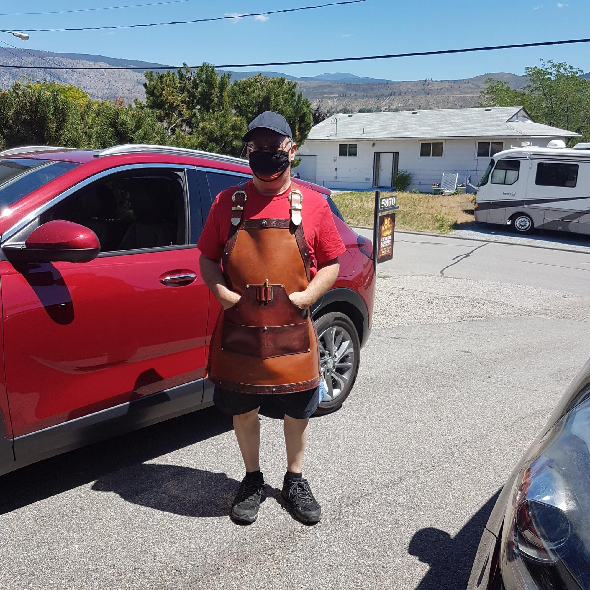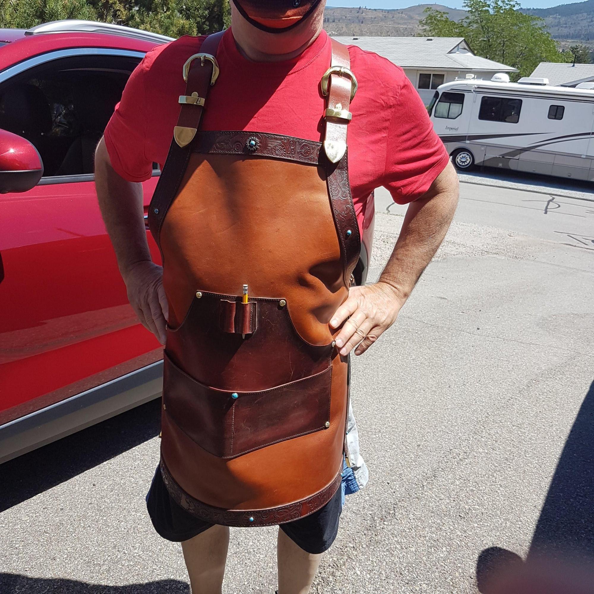 Aprons Assorted, Full Grain Leather, Hand tooled, Hand made in the Okanagan, Oliver, B.C., Canada.