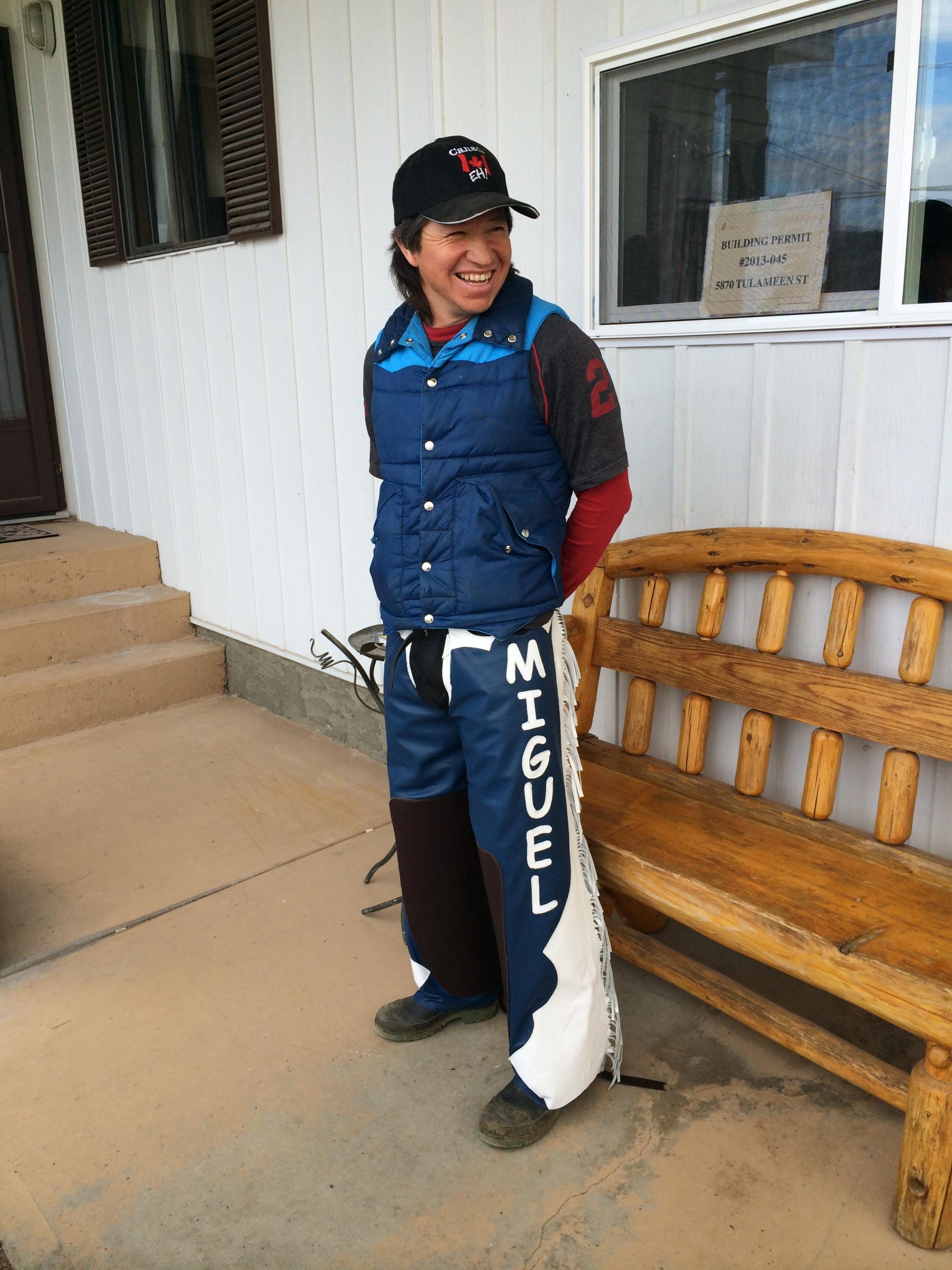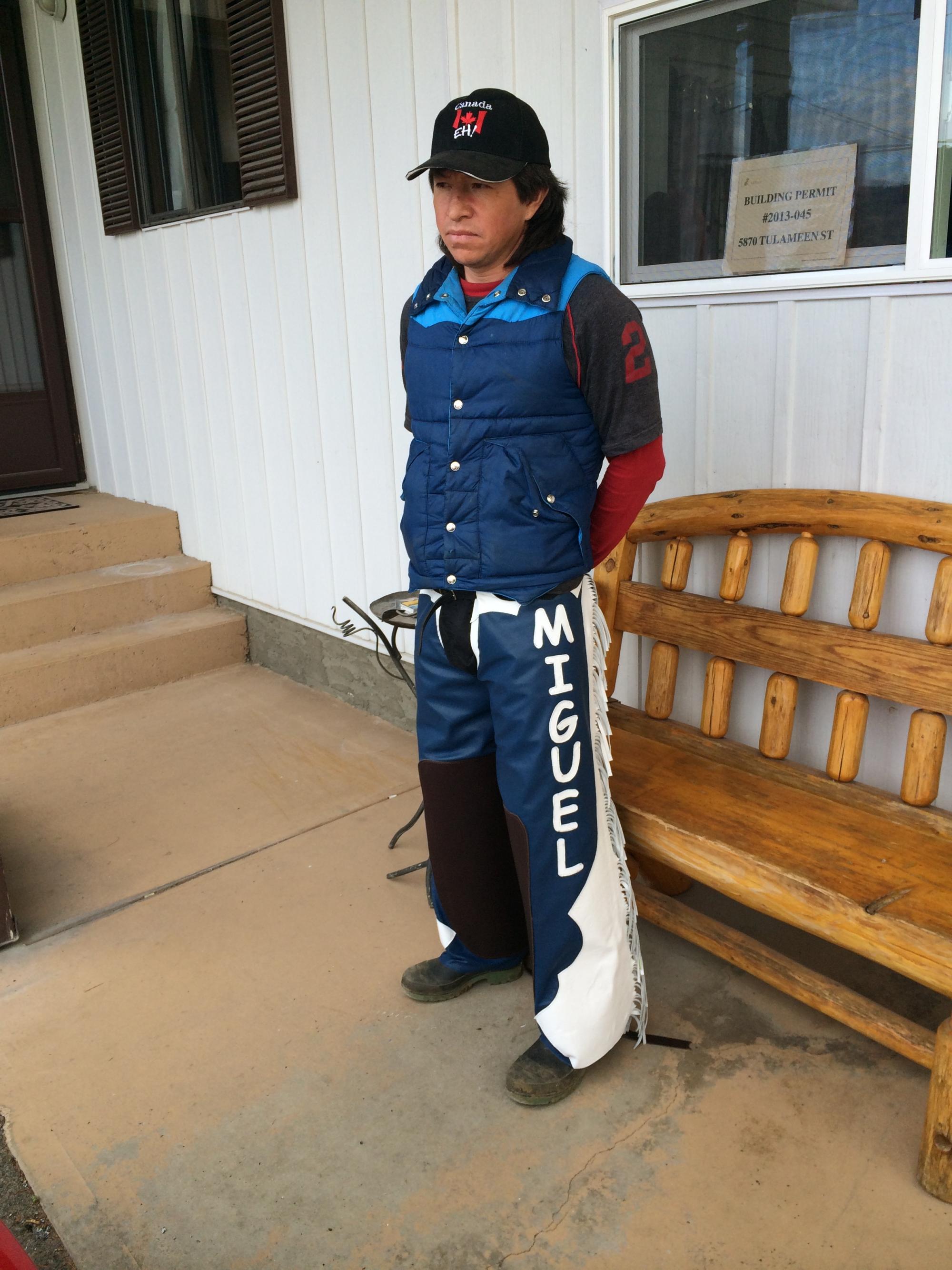 Riding Chaps, Electric Blue and White with 3" fringes and chink patches on inner knee and calf for Miguel a horse trainer who was working in Osoyoos, British Columbia, Canada.