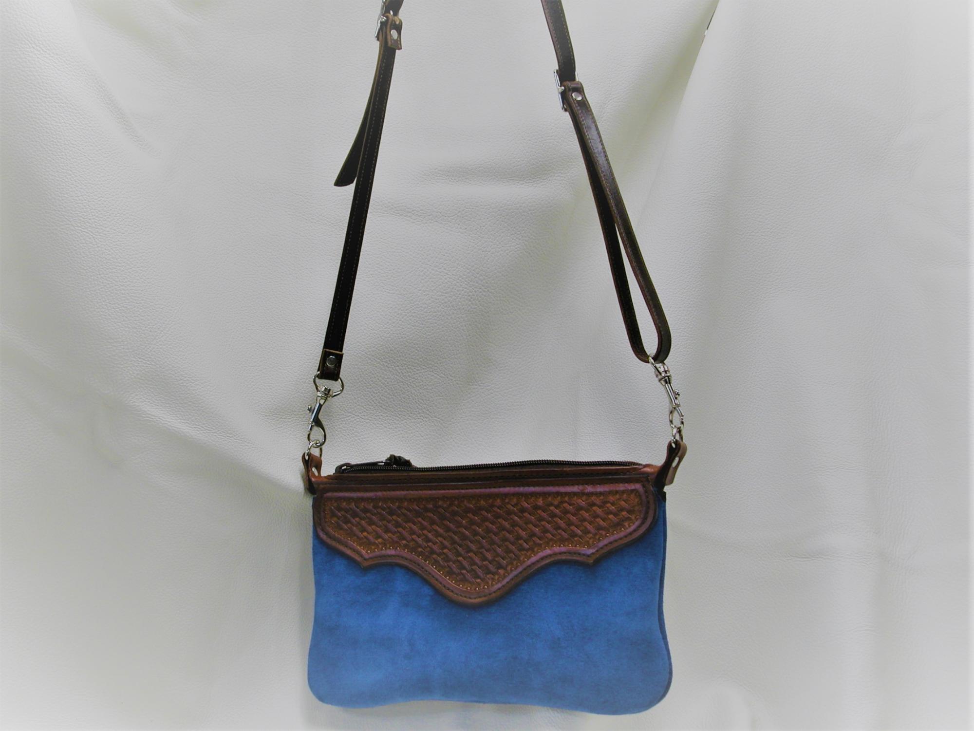 Purse Blue with tooled accents width 10" height 6 1/2", extra inside pocket 8"x 4", with adjustable shoulder strap